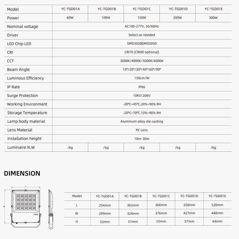 | YC-TGD01-50W | 358*294*52 | 50w | Heat sink Aluminum body,Glass,Bracket,304 screws, PCB, ເລນ. |